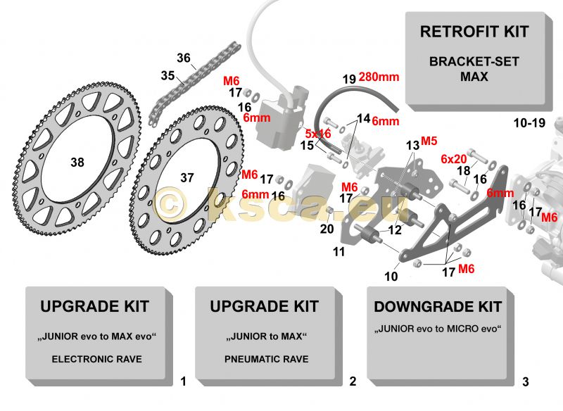 Upgrade Kit 125 Junior evo to Max evo Contains all parts for retrofitting engine from version 125 JUNIOR MAX evo to 125 MAX evo. (E-rave), without E-Box 125 MAX evo, insert: Cylinder MAX, Dichtsatzt 296161, Ravesteuerung 481260.