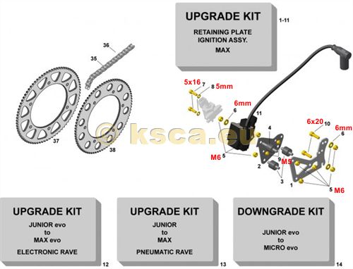 Upgrade Kit 125 Junior evo zu Max evo Beinhaltet alle Teile um den Motor von Ausführung 125 JUNIOR MAX evo auf 125 MAX evo umzurüsten. (E-Rave), ohne Steuergerät 125 MAX evo. INHALT: Zylinder MAX, Dichtsatzt 296161, Ravesteuerung 481260.
